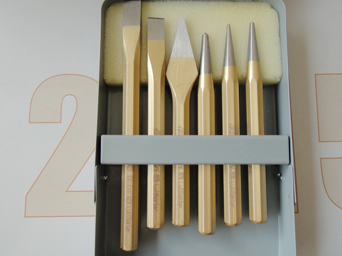 規(guī)格:電感應(yīng)特殊淬火安全區(qū),沖擊頭調(diào)質(zhì)處理;鉻釩空氣淬火鋼,鍛造;6件:125和150mm平鑿各一件,125mm橫切鑿一件,120mm沖子一個(gè),2和3mm打孔沖子,板材盒包裝。
